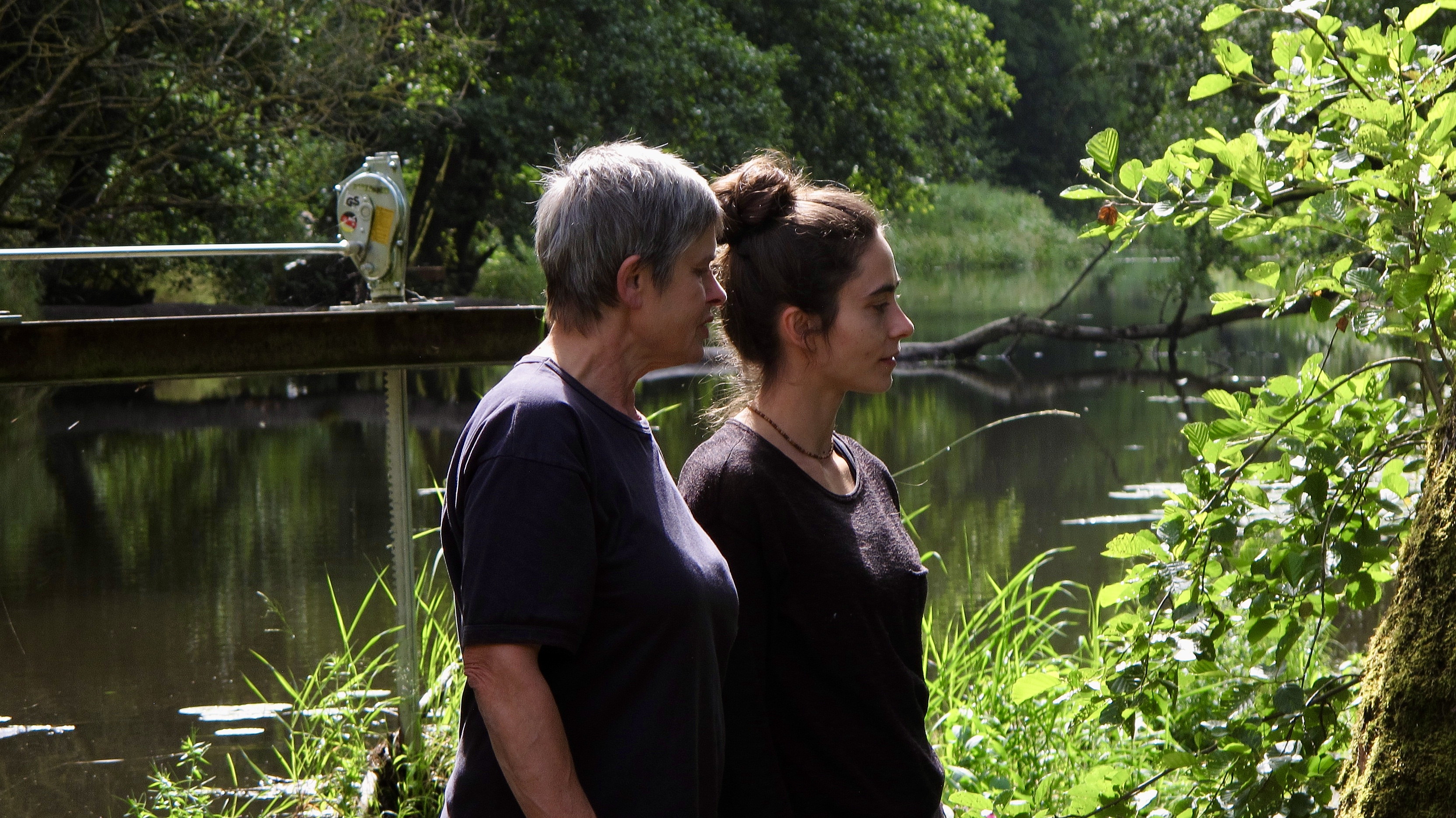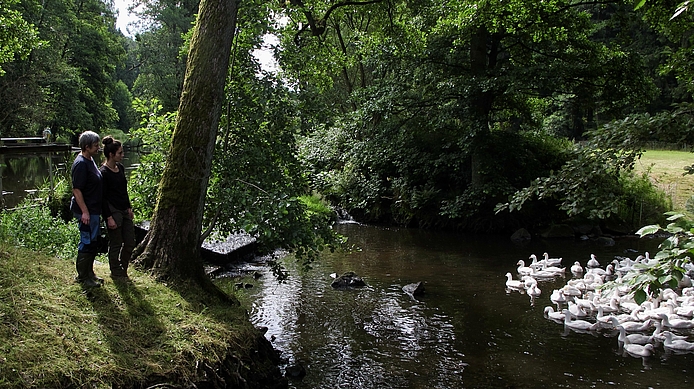 Stefanie Weig und ihre Mutter Sieglinde mit ihren artgerecht aufwachsenden Gänsen vor dem Finstermühlbach, einem Abschnitt der Pfreimd. Bild: Weig